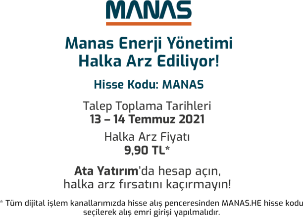 Manas Enerji Yönetimi Sanayi ve Ticaret A.Ş.'nin (Şirket) halka arz edilecek toplam 7.800.000 TL nominal değerli payları, Borsa Birincil Piyasa'da Sabit Fiyatla Talep Toplama ve Satış Yöntemi ile beher pay için 9,90 TL fiyattan 13-14/07/2021 tarihlerinde Tera Yatırım Menkul Değerler A.Ş. aracılığıyla, MANAS.HE (ikincil piyasada işlem kodu MANAS.E olacaktır) işlem sırasında satışa sunulacaktır.